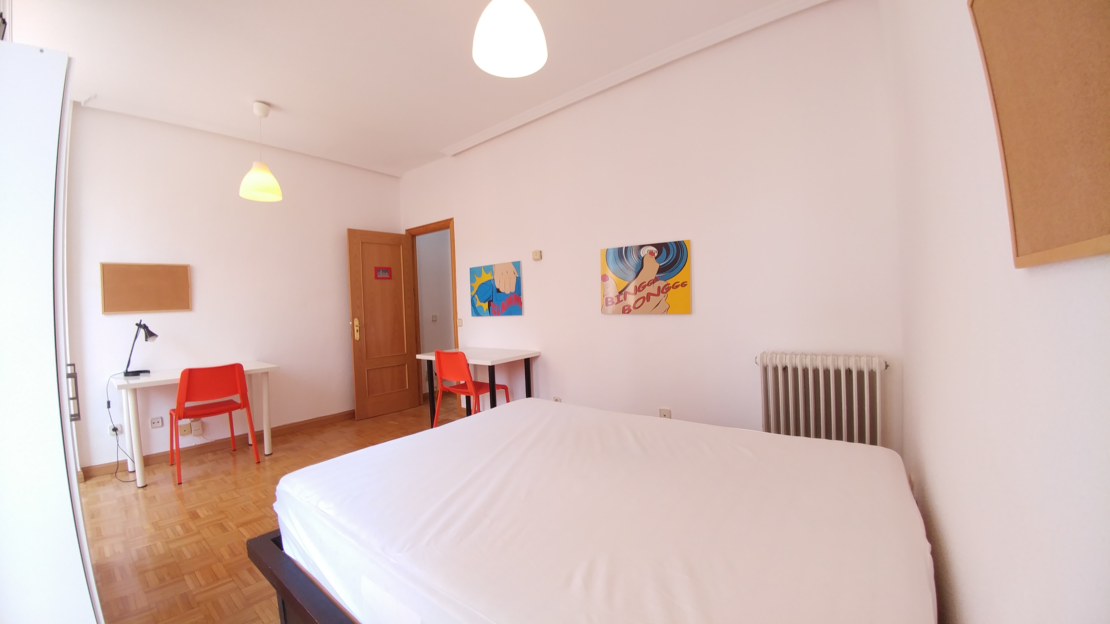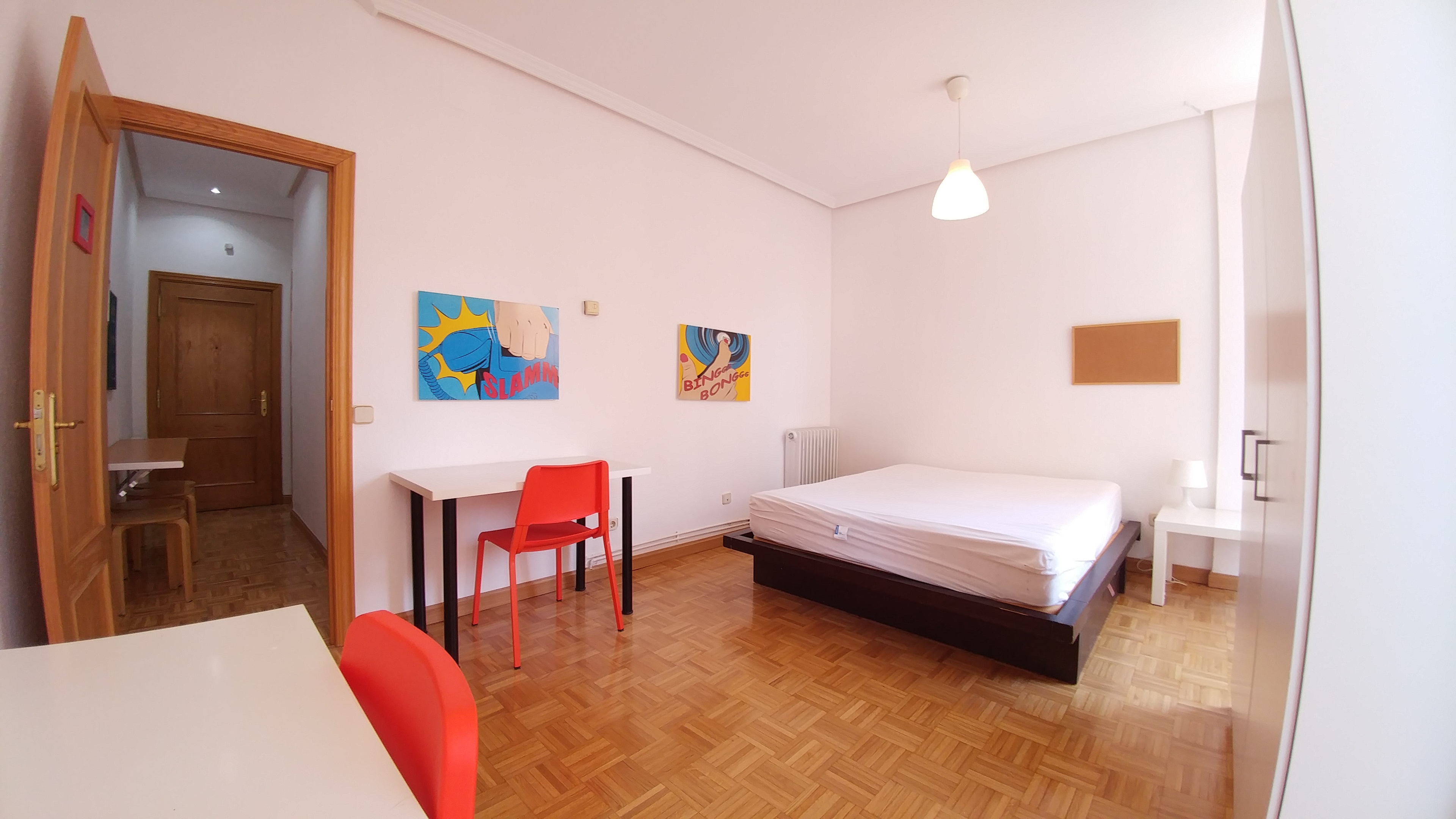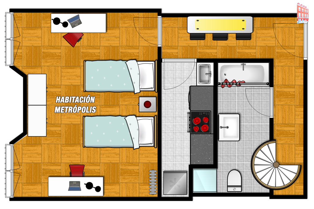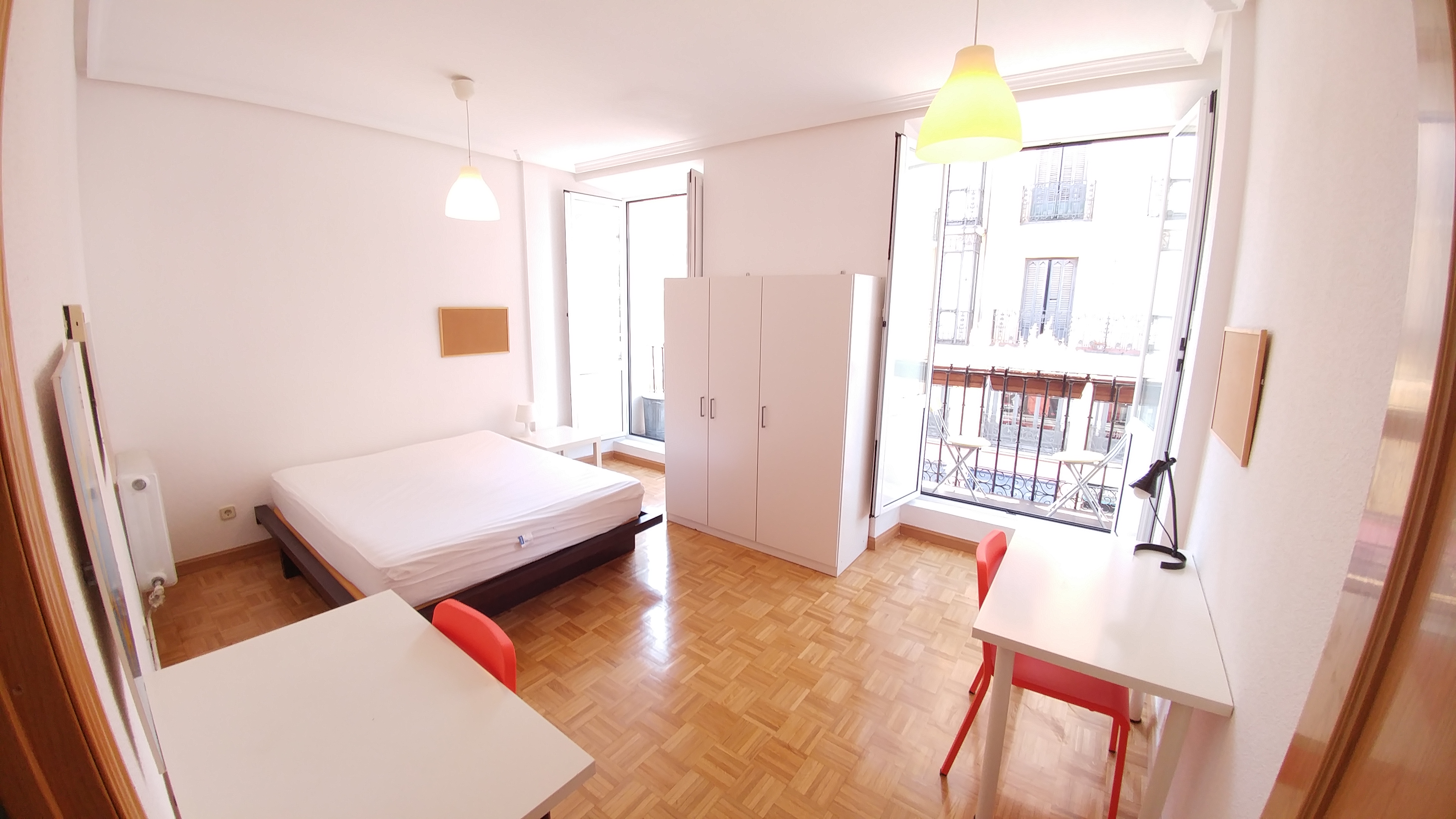 Esta habitación de 17m2 totalmente exterior es muy luminosa y cuenta con dos balcones a la calle. Decorada con un confortable mobiliario que te hará sentirte, "like at home". La habitación Metrópolis es de USO INDIVIDUAL o DOBLE, y cuenta con una cama de 150 cm, con su mesilla de noche, un armario grande y dos amplios escritorios. Esta habitación cuenta un baño propio.
